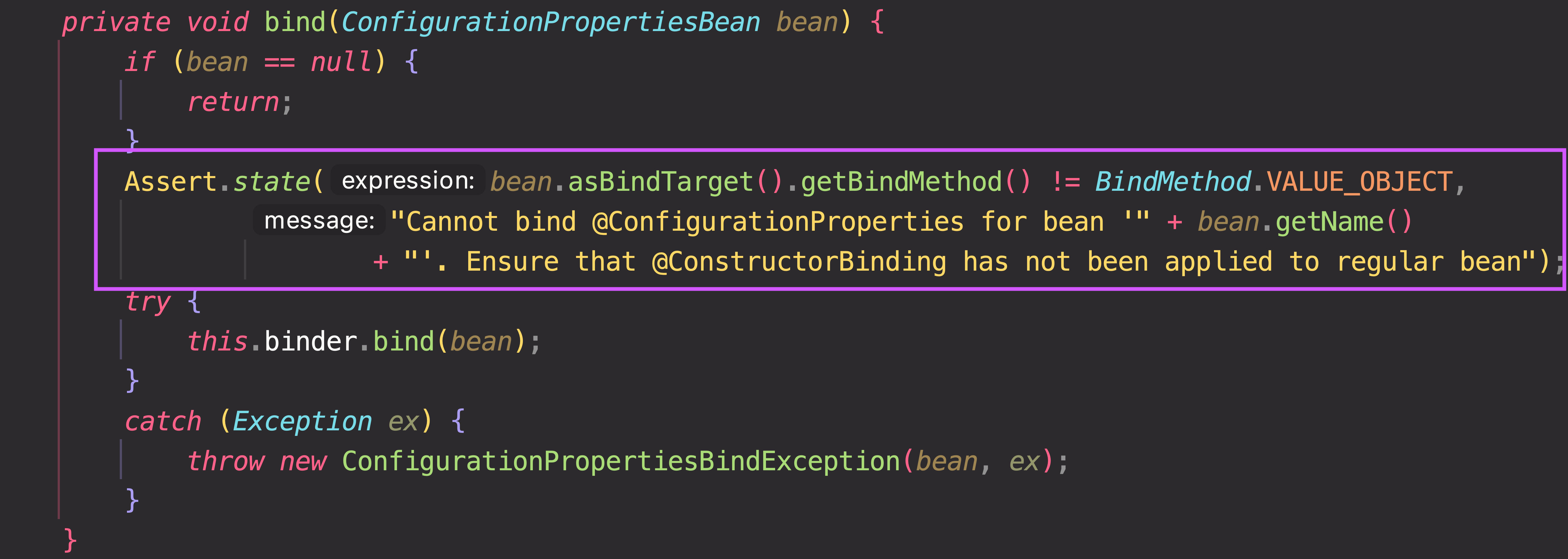 bean에 ConfigurationProperties 값을 바인딩할 수 없으니 Bean에 @ConstructorBinding을 적용하지 말라는 것이다.